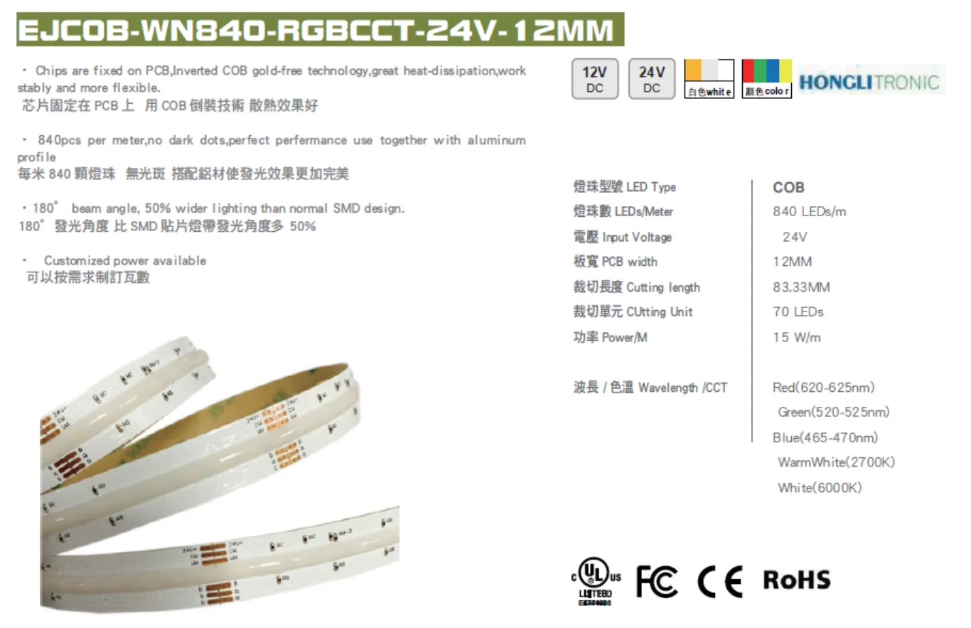 首頁 > 產品介紹 > LED 燈帶系列 > EJCOB-WN840-RGBCCT-24V-12MM-15W