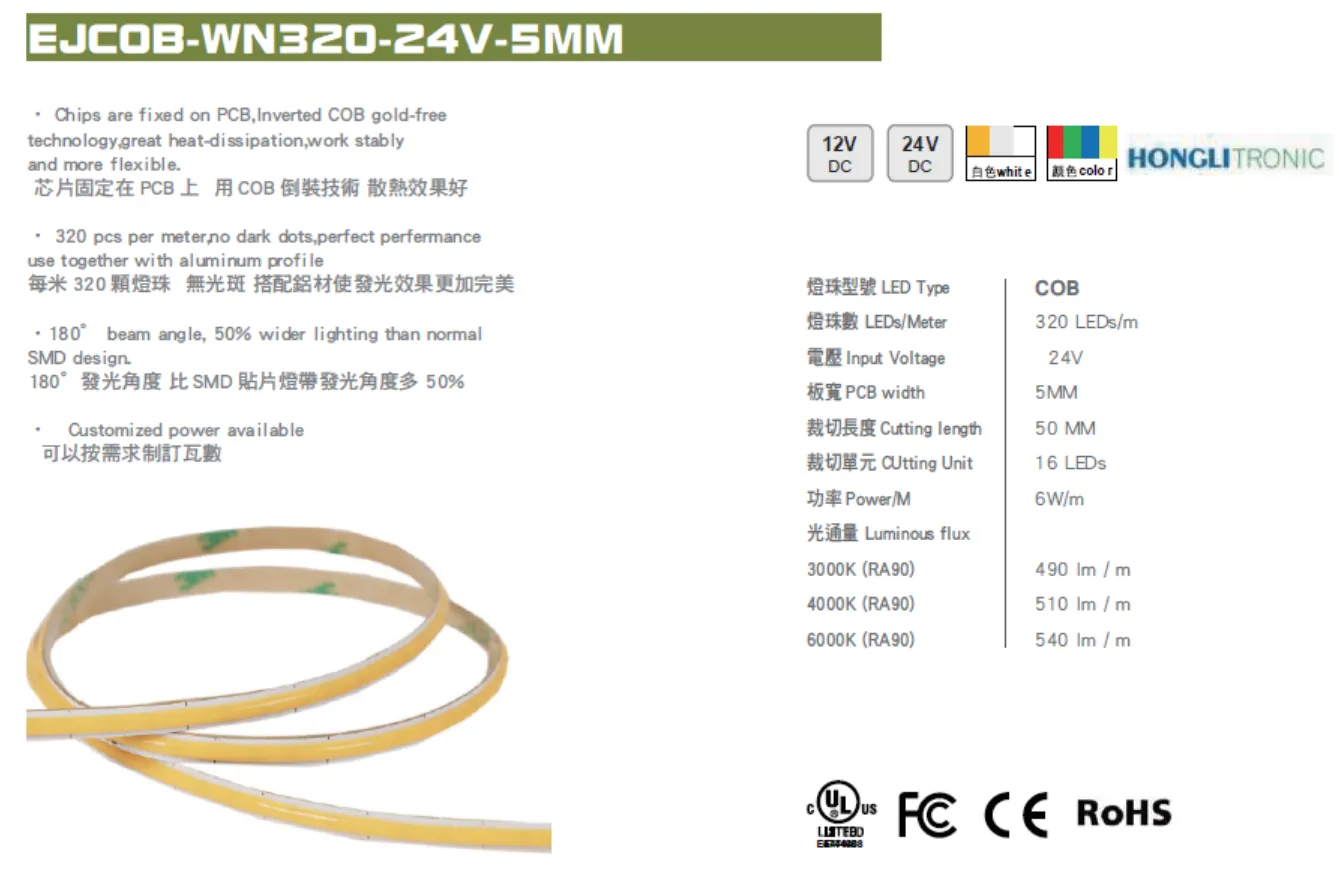 首頁 > 產品介紹 > LED 燈帶系列 > EJCOB-WN320-24V-5MM-6W