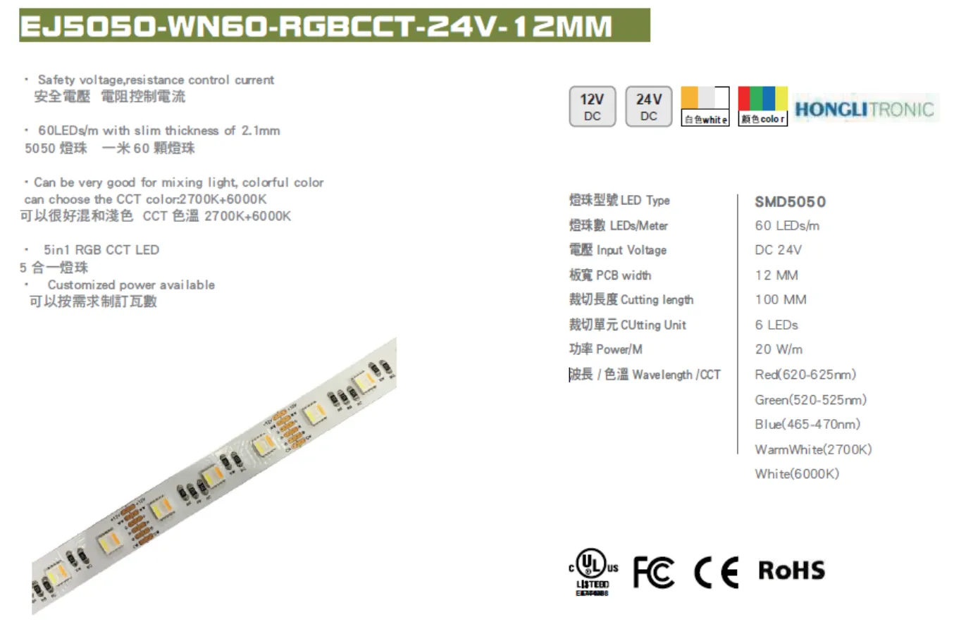 首頁 > 產品介紹 > LED 燈帶系列 > EJ5050-WN60-RGBCCT-24V-12MM-20W