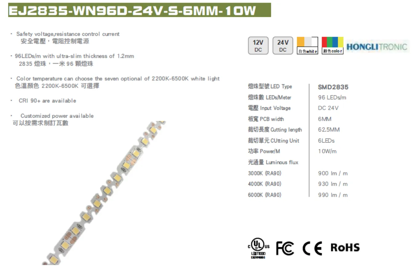 首頁 > 產品介紹 > LED 燈帶系列 > EJ2835-WN96D-24V-S-6MM-10W
