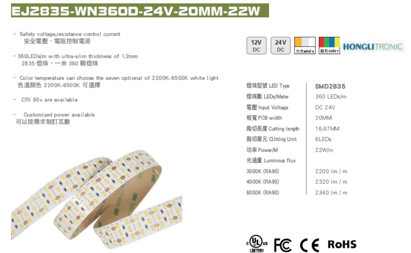 首頁 > 產品介紹 > LED 燈帶系列 > EJ2835-WN360D-24V-20MM-22W