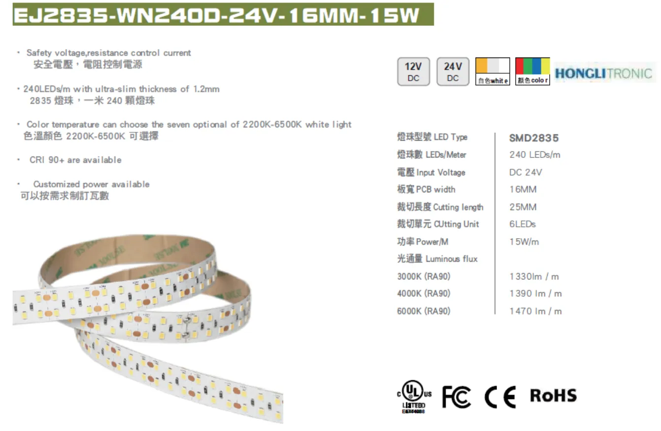 首頁 > 產品介紹 > LED 燈帶系列 > EJ2835-WN240D-24V-16MM-15W