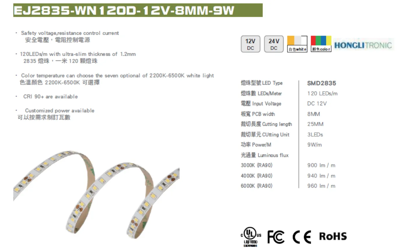 首頁 > 產品介紹 > LED 燈帶系列 > EJ2835-WN120D-12V-8MM-9W
