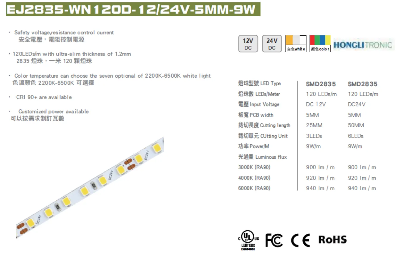 首頁 > 產品介紹 > LED 燈帶系列 > EJ2835-WN120D-12/24V-5MM-9W